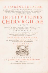 Atlas seul, sans les 4 vol. de texte. Un vol. in-4°, 22 pl. hors texte, certaines dépliantes et légendées, demi chagrin vieux rouge, dos à nerfs soulignés de filets dorés (reliure postérieure). Bel exemplaire . Nous joignons : [Lorenz Heister]. - D. Laurenti Heisteri…Intitutiones chirurgicae … Pars prima. - Amstelodami, apud Lanssonio Waesbergios, 1739. Un vol. in-4°, 10 ff. n. ch. , 715 p., veau blond , dos à nerfs richement orné et doré, tranches rouges. 20 planches dépliantes. Reliure usagée, défauts aux coiffes et charnières, int. correct en dehors de qq. rouss. Première partie seule de ce célèbre anatomiste, botaniste et chirurgien, considéré comme le fondateur de la chirurgie scientifique en Allemagne.