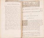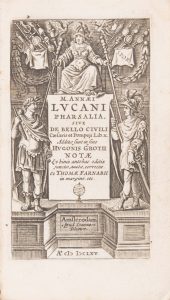 un vol. in-8°, 8 ff. n. ch. y compris le titre gravé, 918 p., 16 ff. d’index n. ch. , un feuillet blanc, veau marbré, dos à nerfs richement orné et doré, pièce de titre de maroquin rouge, filet doré sur les coupes, tranches rouges. Coiffe sup. en partie arrachée, une charnière fendue sur 3 cm, bon état int. Willems 1266, indique une carte pour ce volume, mais ne signale pas la présence de 3 planches hors texte comprises toutefois dans la pagination. Nous joignons : C. Julii Caesaris. - Quae extant, accuratissime cum libris editis et Mss optimis collata, recognita et correcta. Accesserunt Annotationes Samuelis Clarke, S. T. P. … - Londini, : sumptibus et typis J. et R. Tonson, et J. Wattas, 1739. In-8°, 6 ff. n. ch., 510 p., 8 ff. n. ch., demi basane, dos lise orné de filets dorés (reliure post.). 4 cartes dépliantes dont une avec la Corse et la Sardaigne Une charnière fendue, mouillure en début de vol. [Lucain]. M. Annaei Lucani Pharsalia. Sive de bello civili Caesaris et Pompeji lib X additae sunt in fineHugonis Grotii Notae ex binis antehac editis junctae, auctae, correctae. Et Thomae Farnabii in margine etc. Amstelodami : apud Joannem Blaew, 1665. In-12, 329 p., 3 ff. n. ch., veau brun. Titre frontispice. Déafauts aux charnières. Récit épique en latin, demeuré inachevé, plus connu sous le nom de Phasale, de la guerre que se livrèrent César et Pompée.
