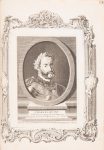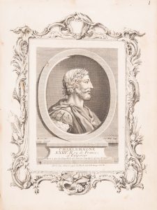 In-4°, veau porphyre un peu frotté, dos à nerfs richement orné et doré, triple filet doré en encadrement autopur de splts, roulette int. dorée, usures à la charnière et à la coiffe inf.. Déchirure marginale affectant l’encadrement d’un portrait, taches anciennes à quatre autres dont deux surchargés à l’encre. Les portraits finement gravés se présentent en médaillon dans un large encadrement.