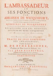ambassadeurs et les ministres publics. Réflexions sur ces mémoires, discours du même Wicquefort de l’élection de l’Empereur et des électeurs de l’Empire. Traité du juge compétent des ambassadeurs, traduit du latin de Mr de Bynkershoek, Président du Haut Conseil de Hollande, etc. par Jean Barberac, professeur de droit public et privé à Groningue. Seconde édition revue et augmentée dans les notes du traducteur.