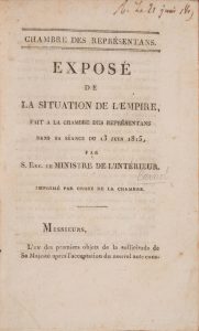 [CARNOT]. - Exposé de la situation de l’Empire, fait à la chambre des représentants dans sa séance du 13 juin 1815, par son Exc. Le ministre de l’Intérieur. Imprimerie de la Chambre des représentants, s. d. (1815). Exposé fait quelques...