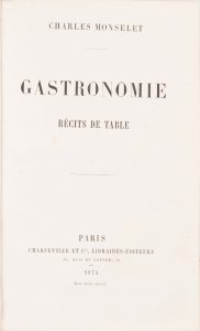 Monselet, Charles.Monselet, Charles. - Gastronomie. Récits de table. - Paris : Charpentier et Cie, 1874.