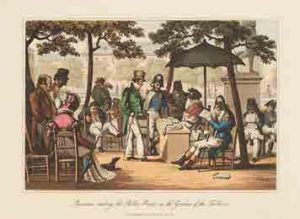 or, titre en long, tranches dorées (reliure anglaise de l’ époque). Ravissant recueil de 21 aquatintes coloriées figurant des scènes de la vie quotidienne à Paris sous la Restauration. Distribution de vin le jour de la Saint-Louis, aveugle du Pont-des-arts, danseurs sur des échasses aux Champs Elysées, Bureau général des nourrices, cours de natation à la piscine publique, lecture des journaux aux Tuileries, les Catacombes et la Morgue, marchands ambulants et amuseurs publics, etc. Les planches de ce recueil avaient déjà parues en 1824, dans l’ouvrage intitulé Tour of Paris, et quatre d’entre elles avaient également été éditées dans le recueil de Peake : The Characteristic Costume of France. Chaque planche est accompagnée d’un texte explicatif détaillé. Certaines planches ont des filigranes datés de 1824 et de 1825. Reliure frottée. Quelques rousseurs atteignant peu les planches. (Abbey, Travel, 113-114.- Tooley, 443-444.- Colas, Bibliographie du costume et de la mode, 2898.)