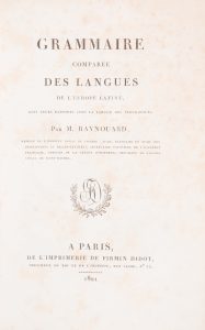 In-12, 359 p., veau marbré, dos lisse richement orné et doré, coupes dorées, tranches rouges. Bon exemplaire. Prosodie françoise ; Essais de grammaire ; Remarques sur Racine, augmentée de de la réponse de Voltaire à l’auteur. Nous joignons : Raynouard. - Grammaire comparée des langues de l’Europe latine, dans leurs rapports avec la langue des troubadours. - À Paris : de l’imprimerie de Firmin Didot, 1821. In-8°, veau blond, dos lisse orné et doré. Charnière fendue, un cahier manquant