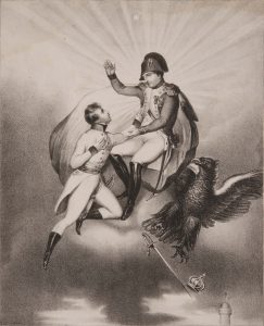 texte sur le testament et sur la mort de Napoléon, au centre Île Ste Hélène avec motif maritime. Déchirures marginales sans manques, petit manque de papier sur l’un des bords sans atteinte à la gravure. Gravure de la 1ère moitié du 19e qui mérite une restauration. Napoléon et son fils. - Ensemble de 4 gravures 19e : La réunion (21 x 26, marges salies) ; Les Deux victimes (28 x 19) ; Le Songe (26 x 19) ; [L’Aiglon sur le trone], (19 x 16), tirage sans doute avant la lettre, une légende au crayon, en marge, précise : Le sommeil du lion.