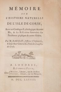 Barral, Pierre. - Mémoire sur l’histoire naturelle de l’isle de Corse, avec un catalogue lythologique de cette isle et des réflexions sommaires sur l’existence physique de notre globe. - London ; - Paris : Molini : Onfroy, 1783.