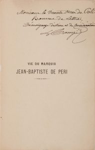 198 p. ; in-8°, pleine basane lie de vin, dos lisse, noms de l’auteur et titre en lettres dorés sur le premier plat. Agréable reliure. Nous joignons : Campi, Louis. - Illustrations ajacciennes : les Corses Français sous Louis XIV : vie du marquis Jean-Baptiste de Peri, lieutenant général des armées du Roi (1674-1721). - Ajaccio : impr. de T. Massel, 1902. - 142 p. ; in-16°, br., dos cassé. Envoi autographe signé de l’auteur à Oscar de Poli.