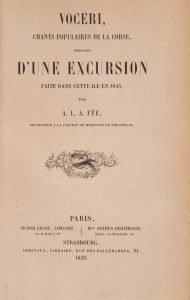Fée, Antoine Laurent. - Voceri, chants populaires de la Corse, précédés d’une excursion faite dans cette île en 1845... - Paris : Victor Lecou : Mme Arthus-Bertrand ; Strasbourg : Derivaux, 1850.