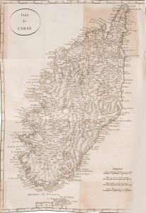 XXXI, [1], 263 p. : carte repliée « Isle de Corse» dans un encadrement de 34 x 24 cm (Beaublé : sculp.) ; in-8°, basane blonde à petits coins, dos lisse orné de palettes dorées, tranches paille. Petits trous de ver près des charnières, légères rouss. à la carte, sinon bon état.