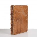 12 (sur14) ff. n. ch., 282 ff. ; in-4°, veau fauve, dos à nerfs richement orné et doré, double rang de filets dorés en encadrement autour des plats, tranches rouges. Reliure très usagée, page de titre sommairement restaurée mais sans manque au recto et au verso où figure une vignette, petite galerie de vers en marge de 3 ff. au début, petit trou au feuillet Cc, petite restauration marginale au feuillet m2, manque le feuillet S4, déchirure sans manque au feuillet 181, 4 ff. manuscrits en fin de volume, parfaitement calligraphiés, un cahier un peu bruni. Ex libris héraldique D. de Auria. Des armoiries non identifiées ont été sommairement incrustées au dos de l’ouvrage.