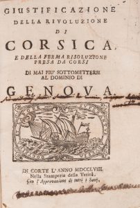 [Salvini, Don Gregorio]. - Giustificazione della rivoluzione di Corsica, e della ferma risoluzione presa da corsi di mai più sottomettersi al dominio di Genova. - Corte : Nella stamperia della Verità. Con l’approvazione di tutti i Savj, 1758.