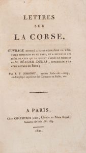 Simonot, J. F. - Lettres sur la Corse, ouvrage destiné à faire connaître la véritable situation de ce pays, et à rectifier les idées de ceux qui le jugent d’après le mémoire de M. Réalier-Dumas, conseiller à la cour royale de Riom,...