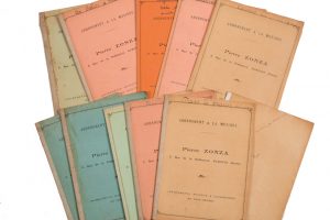 Nous présentons ici l’archive personnelle de Pierre Zonza, composée de : son diplôme de Président de société musicale à Ajaccio, deux cartes postales de L’ Estudiantina ajaccienne, une photographie du groupe datée de 1909, au moment de la création de cet ensemble (le peintre ajaccien Émile Brod figure sur ce cliché) ; environ160 partitions manuscrites présentant les arrangements réalisés par Pierre Zonza et Augustin Giacobini (18..- 1913), compositeur et directeur du groupe. Son frère François-Xavier Giacobini (1889-1905) est l’auteur de la musique du chant patriotique corse L’Ajaccienne écrit en 1848 par Jean-François Costa. Environ 378 partitions imprimées.