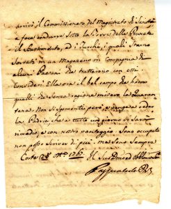 Au sujet de l’incident avec un bateau corsaire turc qui pour échapper à une galère et une felouque génoises, a préféré plutôt se diriger vers la Padulella et aux Prunette. Les Turcs voulaient se cacher dans le maquis, mais quelques villageois qui travaillent dans ces environs les ont rencontrés et les ont empêchés de s’enfuir. Puis arriva le commissaire du magistrato de santé qui fit diriger le bâtiment des turcs vers les Prunette. Les Turcs sont retenus dans un magasin en compagnie de quelques villageois. Il est ensuite question de quarantaine….