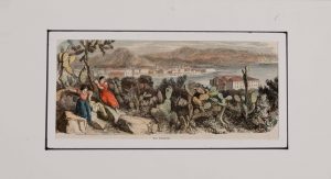 Lot de gravures et représentations diverses de la Corse. Représentation aquarellée peu courante de la Tour de la Mortella.