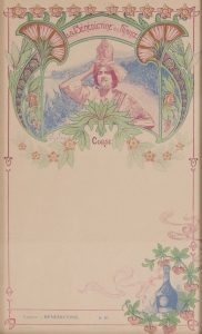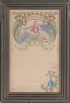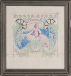 Gouache originale en couleurs sur papier dans le style Art Nouveau représentant une femme Corse devant Erbalunga. Sous encadrement, à vue : 28,5 x 28,5 cm. On joint un menu imprimé en couleurs d’après la gouache. A vue : 25,5 x 15,5 cm.