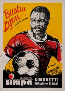 Rare affiche couleur sérigraphie de Monique Corrieri avec plusieurs signatures autographes de joueurs dont Claude Papi et Roger Milla.