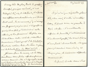Envoi de sa Renaissance, dont l’introduction est « ce que j’ai écrit de plus fort contre nos ennemis (du parti religieux) » ; recommandations pour la publicité dans L’Indépendance, ou « un journal patriote »... 24 juin 1855. Envoi de sa Réforme... 14 mars 1856. Remerciement d’avoir parlé de L’Oiseau, « même avant sa naissance », et explication des causes du retard des Guerres de religion... 30 juin 1856. « Je m’extermine en ce moment à achever la Ligue [...]. Ce temps misérable, d’une si grande désolation morale, nous enseigne à ne point désespérer quoi que nous voyons »... 31 octobre 1857. Sur L’Insecte, « qui, en réalité, est de ma femme plus que de moi »... 25 novembre 1857. « Tout ce que vous écrivez, cher ami, est exquis, sauf la partialité.