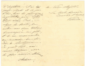 Relative à la visite de Louis-Philipp e au château de Windsor, dans le cadr e du rappr ochement fr anco-br itannique [Victoria s’était rendue au château d’Eu en 1843]. « Permettez que je vous importune avec quelques lignes, pour demander à Votre Majesté comment le cher Roi se porte, appres son fatiguant voyage. J’ai été désolée de tous les contre temp s auquelle il lui a fallu de se soumettre, en quittant l’Angleterre ! J’ai passer lundi et le jour d’hier, dans les plus grandes inquiétudes pour notre bien aimé Roi ! – Ayez la bonté, de mettre mes bien tendres hommages à ses pieds, et de me recommander au souvenir du cher D. de Montpensier »...