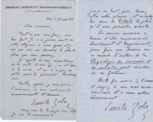 Émile ZOLA (1840-1902) 5 L.A.S., Paris 1864-1865, [à Émile Deschanel, au Journal des Débats] ; 5 pages et demie in-8 et 2 pages in-12, la plupart à en-tête Librairie de L. Hachette et Cie.