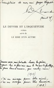 ELUARD (Paul). Le Devoir et l’Inquiétude. Poèmes. Suivis de Le Rire d’un Autre. Ornés d’une gravure sur bois par André Deslignères. Paris, Gonon, 1917.