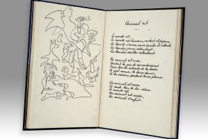 36 feuillets montés sur onglets (ceux comportant un dessin relié en regard du poème correspondant), en un volume grand in-8, veau mi-noir mi-bleu roi sur les plats et le dos, titre sur les plats et nom de l'auteur sur le dos en lettres dorées, bordure intérieure ornée d'un filet doré, tête dorée, étui (Georges Hugnet).