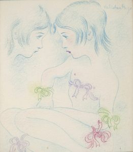 - Sur la page de garde, d’un dessin original en couleurs signé de Valentine Hugo, représentant deux enfants.
