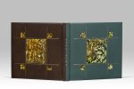 Petit in-12 carré, box vert olive et Lavallière, plats ornés d’un jeu d’un filet s’entrecroisant encadrant des pièces de toile et fils noirs amalgamés sous vernis, doublure et gardes de daim vert et marron, tranches dorées sur témoins, couverture et dos conservés, chemise, étui (Leroux, 1986).