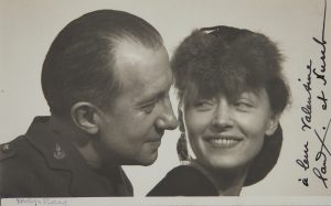 Très belle et célèbre photographie prise en 1939, à Mignères (Loiret), où Eluard avait été mobilisé comme lieutenant d'intendance. "Nusch, pension­naire d'un café, vit dans le pays" (R.-J. Ségalat). Leur ami Man Ray, venu les visiter, les a photographiés tous deux, Eluard portant l'uniforme, se penchant vers Nusch qui lui sourit (voir reprod. agrandie in Album Eluard, Pléiade, p. 222, ainsi que dans la plupart des ouvrages consacrés à Paul Eluard).