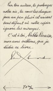 (1938-1942), paru en 1942. Dédicace nullement privée, mais destinée au contraire à figurer dans le livre imprimé. Et ce manuscrit est celui-là même, comme le montre une indication d'une autre main, qui sera reproduit, en fac-similé, en tête de l'édition. Picasso était certainement le peintre qu'Eluard admirait le plus, et son texte est un vibrant hommage :