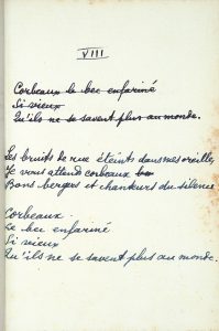 Certains poèmes manuscrits comportent de légères variantes par rapport au texte imprimé. Les poèmes IV et V ont été inversés dans la version imprimée, le poème VI manuscrit ne figure pas dans la version imprimée ; les poèmes VIII manuscrits diffèrent de la version imprimée ; le poème X manuscrit est légèrement différent de celui imprimé.
