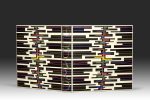 In-4 oblong, veau entièrement mosaïqué d’un décor de bandes rectangulaires de dimensions et de couleurs variées (on peut en compter plus d’une quinzaine, les plus belles et les plus chatoyantes), dos orné de même portant le nom d’Eluard à la chinoise en grands caractères, doublure et gardes de box gris perle, tranches dorées sur témoins, couverture et dos conservés, chemise demi-veau blanc à rabats, étui bordé (P.-L. Martin, 1964).