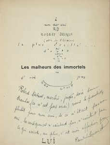 Exemplaire de Robert Desnos portant ce double envoi autographe signé sous forme de calligramme :