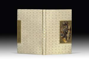 Petit in 12, box tressé beige, premier plat orné vers l’extérieur d’un rectangle de box vert bronze avec inclusion de coulées de résines de tons sombres, doublure de box vert et gardes de daim vert, tranches dorées sur témoins, chemise demi-box vert, étui (Leroux, 1969).