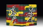 In-8, bandes multicolores de box de tons vifs : vert, rouge, citron, bleu ardoise, inégalement disposées, sur lesquelles vient se projeter un motif mosaïqué de veau blanc et noir, dos plat orné de même, doublure de box bleu ardoise et garde de box citron pour le premier plat, et rouge et vert pour le second, tranches dorées sur témoins, couverture et dos conservés, chemise, étui (Paul Bonet, 1955).