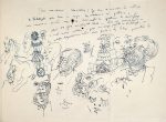 12 - 8 pages de manuscrit et de dessins originaux de Salvador Dalí, sur 5 feuillets. « Le point de vu surrealiste », illustré de dessins au crayon (p. 1, repliée) ; « Surrealist woman romance » scenario de Salvador Dalí Marx Brothers avec de très nombreux dessins originaux à l’encre (1p. ½ sur un feuillet recto-verso replié) ; très nombreux dessins (têtes, cheval, …) sur le brouillon d’une lettre à « monsieur Noailles » (1 page repliée) ; notes quasiment illisibles au crayon avec dessin d’un jeune homme au crayon, au dos magnifique dessin à l’encre (2 pages sur 1 f. replié) ; dernier feuillet avec notes recto-verso et dessins à l’encre de nus, village de bord de mer, profil, femme avec chapeau, etc.