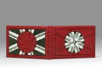 In-16 oblong, façon autruche rouge, chaque plat orné d’un cercle transpercé de fines baguettes demi-rondes sur fond de box noir et blanc, le premier plat avec rond percé au centre, doublure façon autruche, gardes de daim rose, tranches dorées sur témoins, couverture et dos conservés, chemise, étui (Leroux, 1988).