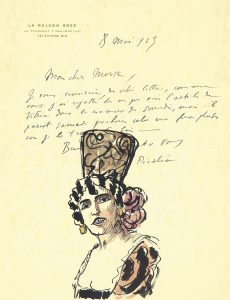 1 page in-4 avec en-tête, contenant un dessin original aquarellé (visage d’Espagnole), sous chemise demi-maroquin noir.