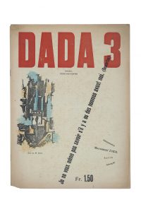 DADA 3. Administration : Mouvement Dada. Zurich, [Imp. J. Heuberger], décembre 1918. Plaquette grand in-4 de 16 pages non chiffrées, couverture illustrée d’un bois de M. Janco mis en couleurs. Textes de T. Tzara (dont l’important Manifeste Dada 1918 occupe 3 pleines pages), G. Raimondi, P. Reverdy, F. Picabia, P. Albert-Birot, F. Hardekopf, P. Dermée, V. Huidobro et R. Huelsenbeck. Nombreuses illustrations dans le texte de H. Arp, M. Janco, A. Segal, E. Prampolini, F. Picabia, H. Richter et une planche hors-texte intitulée Gravure originale de Marcel Janco.