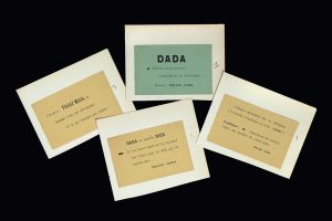 Réunion complète des 4 papillons dans un état exceptionnel, contrecollés sur papier fort, résultant de la collaboration d’Eluard et de Tzara, et expédiés par ce dernier de Zurich en décembre 1919, toute première utilisation dans le domaine artistique de cette technique publicitaire qui se généralisera sous Dada et sera largement exploitée par les surréalistes.