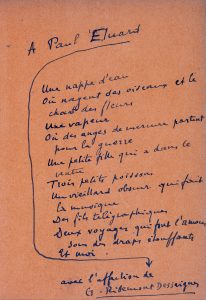 Un des 12 exemplaires sur papier orange signé par l’auteur, celui-ci portant ce magnifique poème-envoi autographe signé à Paul Eluard :