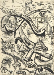 Cette célèbre eau-forte intitulée « Dynamiques fines omelettes » se rapproche de l’illustration de Dalí pour Les Chants de Maldoror, paru chez Skira l’année précédente.