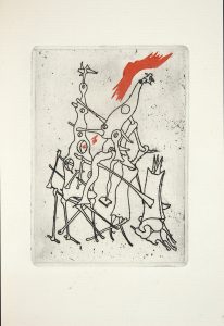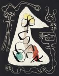 Pour Le Désespéranto, la suite des 8 eaux fortes de Miró est totalement différente de celle publiée dans l’ouvrage. ces gravures tirées sur fond noir sont de véritables œuvres originales car elles comportent au centre une composition à l’encre de Chine et à l’aquarelle de l’artiste.