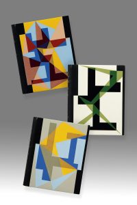 3 volumes in-16 carré, demi-box noir, chaque plat orné d’un décor géométrique de papiers découpés de différentes couleurs, doublure et gardes de papier, têtes dorées, couvertures et dos conservés, chemises, étui (P.-L. Martin, 1961).