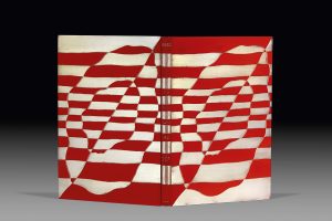 Petit in-8 carré, bradel demi-maroquin rouge, plats de métal argenté ornés d’un décor géométrique en relief de bandes brisées de plexiglas rouge, dos orné de larges bandes au palladium et de maroquin rouge alternées, non rogné, couverture et dos conservés, étui (Mercher, 1966).