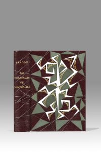 In-8, maroquin grenat, plats ornés d’une composition géométrique de box gris clair et gris foncé bordés de jeux de filets dorés, dos lisse orné de filets à froid, doublure et gardes de daim gris, filets dorés en encadrement, tête dorée, tranches dorées sur témoins, couverture et dos conservés, chemise demi-maroquin bordeaux à rabats, étui