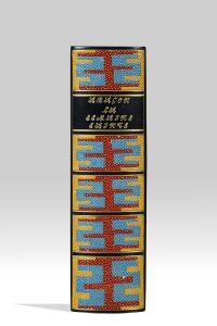 In-8, box bleu foncé, plats encadrés d’un filet doré, dos lisse mosaïqué de maroquin rouge, bleu clair et havane orné de pointillés dorés, doubles gardes de papier glacé rouge, tranches dorées sur témoins, couverture et dos conservés, étui (P.-L. Martin, 1960).
