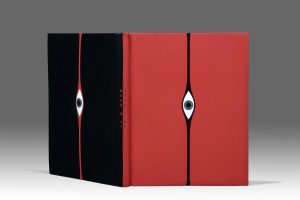In-4, box rouge et noir, premier plat décoré au centre et en long d’un listel de box noir et d’un œil en relief de box blanc, gris et noir, dos rouge et noir orné du titre en lettres de couleur opposée, second plat orné d’un listel de box rouge et d’un œil en relief de même couleur, doublure et gardes de daim noir, non rogné, couverture et dos conservés, chemise demi-box noir à rabats, étui (Leroux, 1950).