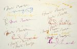 On a joint une double page in-12 portant un essai de 20 signatures autographes a l’encre de différentes couleurs, d’André Breton (11), René Char (4) et Paul Eluard (5).