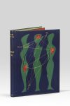 In-12, box bleu, plats ornés d’un important décor mosaïqué de box vert et rouge représentant trois silhouettes stylisées verticales, illustrant chacune un des trois centres vitaux de l’être : le cerveau, le cœur et le sexe, reliées entre eux et à des symboles dispersés par un réseau de filets dorés discontinus, doublure et gardes de daim rouge, tranches dorées sur témoins, couverture et dos conservés, chemise, étui (Paul Bonet, 1965).